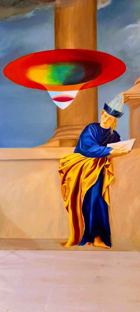 In quel dipinto, per esempio, c’è un disco voltante che allude al moto di espansione dell’universo che ho rappresentato così perché un un fisico contemporaneo, Andrej Linde, che ha basato la sua ricerca sull’universo inflazionario, l’aveva pensato in questo modo. Ho sempre cercato un ponte tra il passato e la contemporaneità e la contemporaneità è anche la fisica, grande serbatoio di ispirazione.