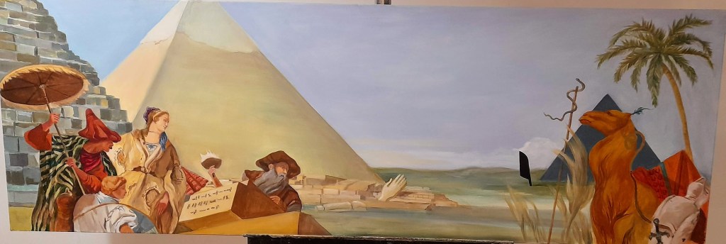 Questo quadro non ha titolo ed è un esperimento, come spesso capita. Ci sono alcuni esperimenti che sono anche testimonianze del mio amore: per i rebus, per l’Egitto, per Tiepolo a cui sono dedicate le figure che sono qui. Poi c’è la presenza di una figura di spalle misteriosa che ho inserito nel quadro, qui sulla destra. E poi c’è una piccola citazione… Chi va contro il popolo, va contro Dio, con il rebus. La mia idea si riassume nel fatto di essere un’artista affezionata all’idea del popolo, della collettività.